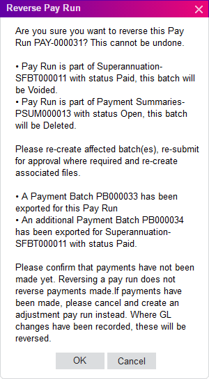 - Read the Reverse Pay Run message. If you still want to reverse the pay, click OK.