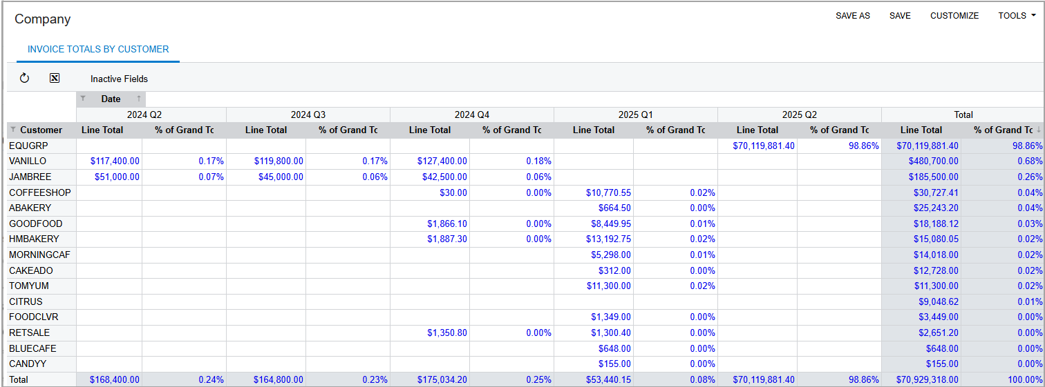 - Drag Line Total from the Fields pane to the Values pane. The pivot table will display invoice amounts, aggregated by quarter, for each customer.