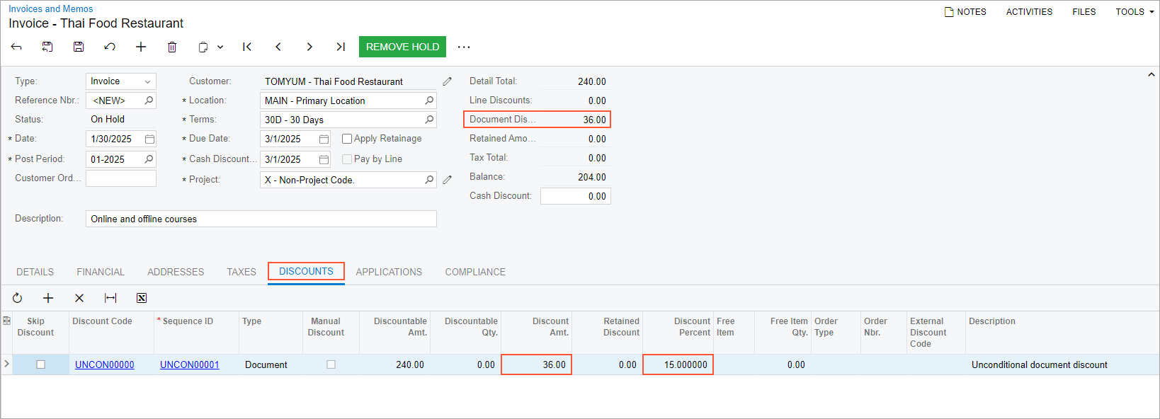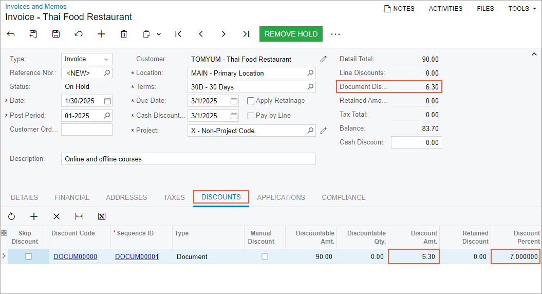 First, you will configure discount codes on the Discount Codes (AR209000) form. Then on the Discounts (AR209500) form, you will configure an automatic document discount specific to the Thai Food Restaurant company and an automatic unconditional document discount for all customers.