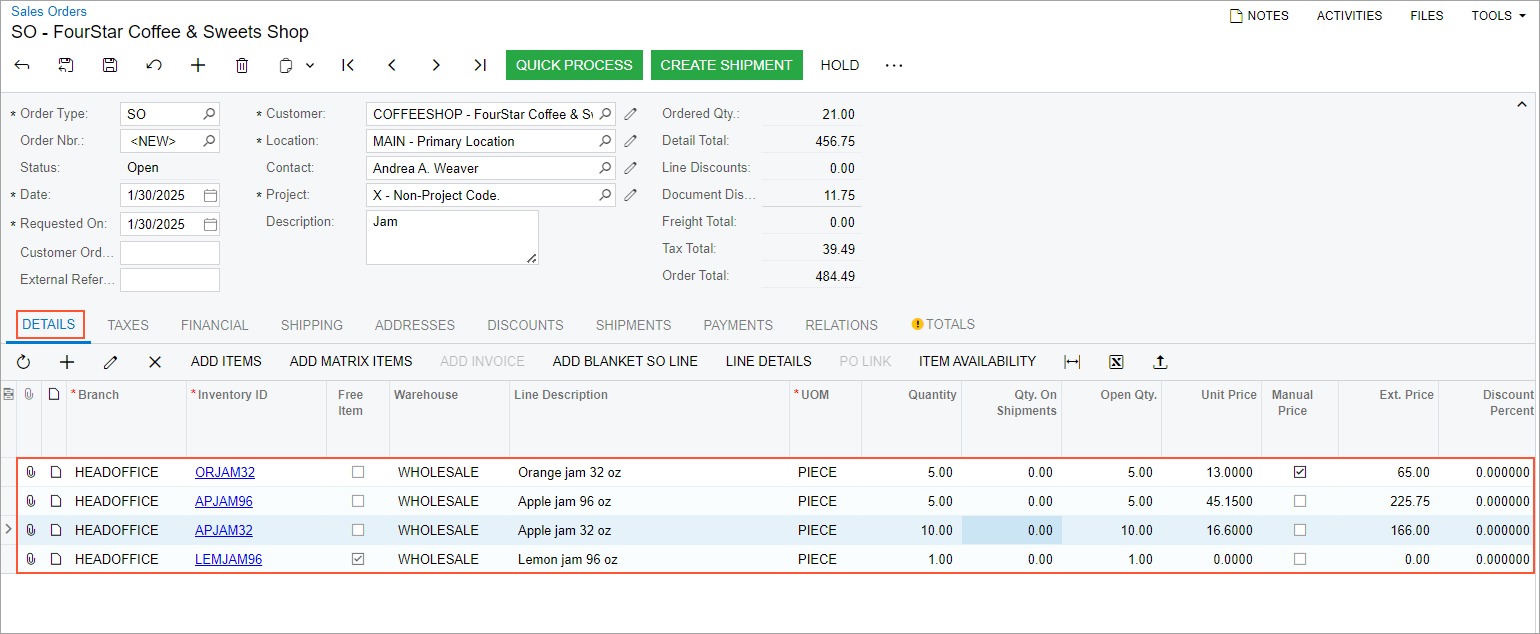 Notice that another row, which contains the LEMJAM96 stock item, has been automatically added to the order, and the Free Item check box has been selected in the row (see the following screenshot).Figure 1. Details tab of the Sales Orders form with a free-item group promotional discount