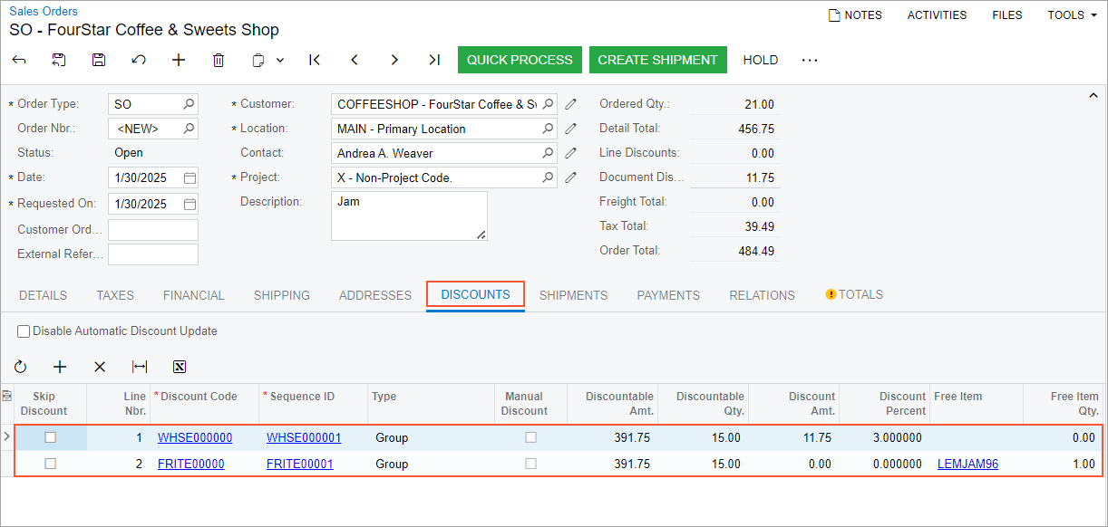 To review how the discounts are applied to the sales order, you will then create a sales order on the Sales Orders (SO301000) form and add items to observe the application of discounts. You will not need to save or process this sales order.
