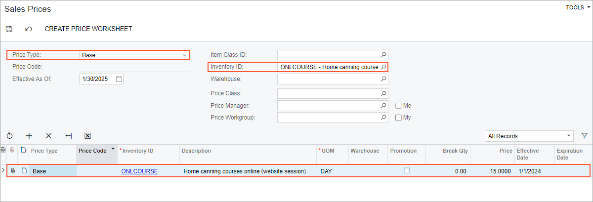- In the table, review the base price of the ONLCOURSE non-stock item in