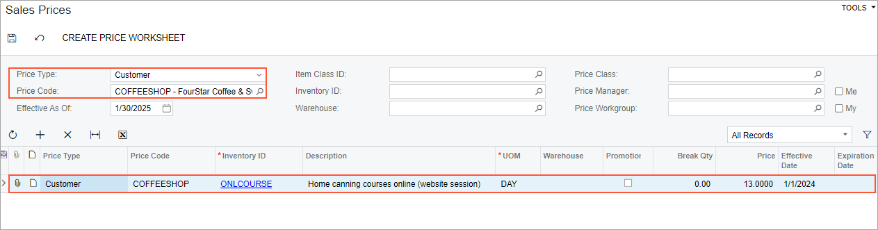 - In the Price Code box, select COFFEESHOP.