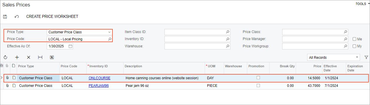 - On the Customer Price Classes (AR208000) form, the LOCAL customer price class has been created.