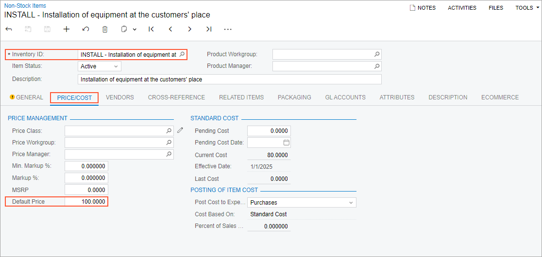 Figure 5. The default price of the INSTALL non-stock item