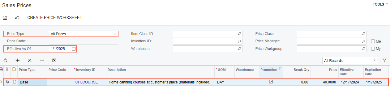For a particular item, on the Sales Prices (AR202000) form, you will view the prices specified for a customer and for a customer price class. You will also view base prices and promotional prices for the item. You will view the default price of a particular non-stock item on the Non-Stock Items (IN202000) form.