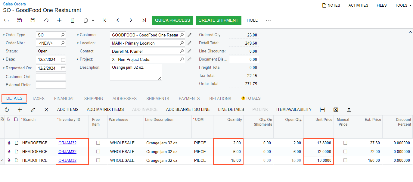 To test the volume-based prices you have entered, you will create a sales order on the Sales Orders (SO301000) form, and add lines with different quantities to make sure that the system uses the needed prices for each line.