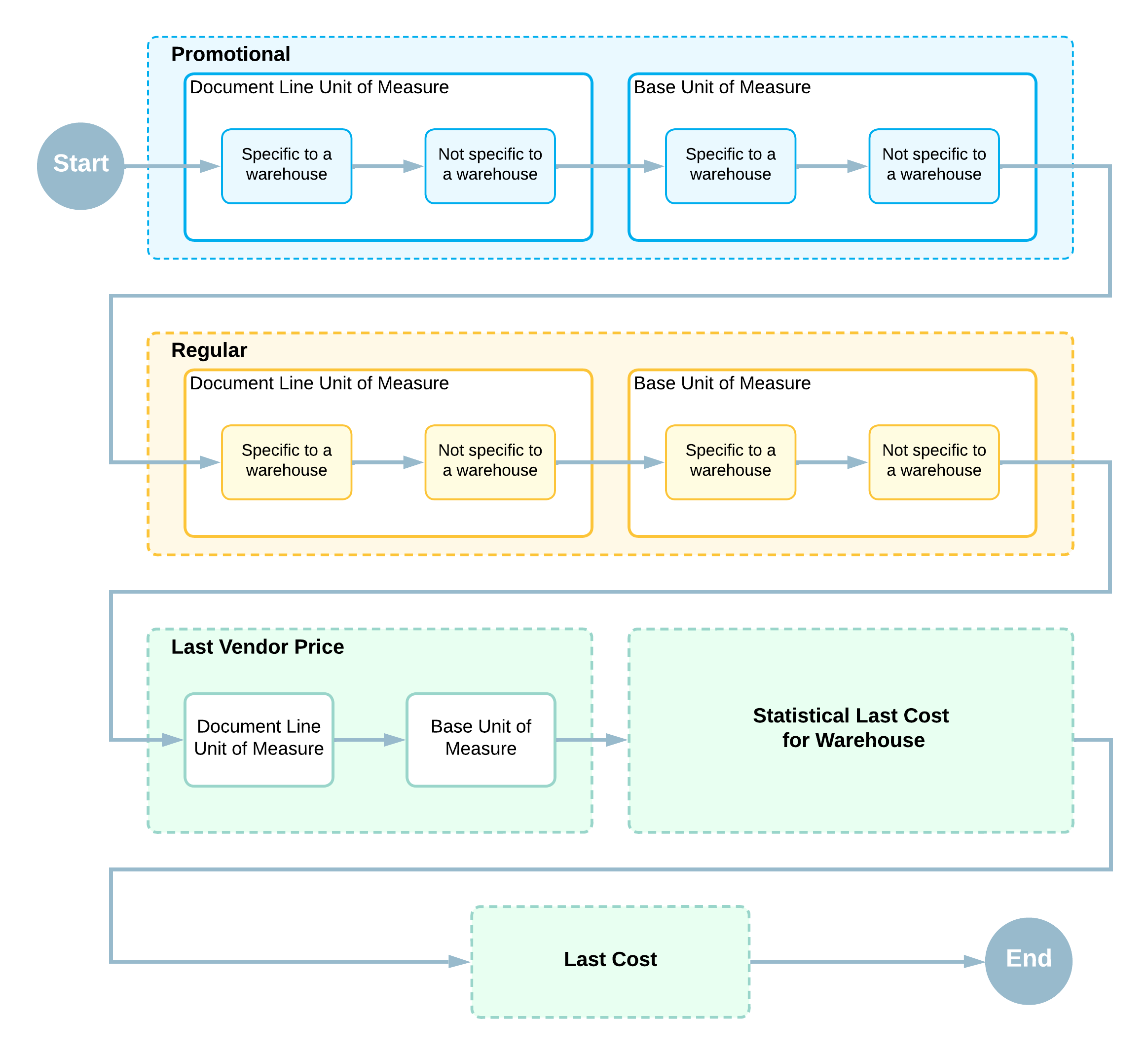 Tip: In this chapter, a regular vendor price refers to a non-promotional price. - The system searches for a last vendor price for the item in the following