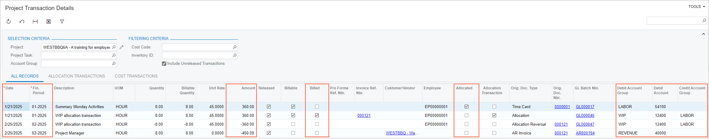 - Billed: This check box is selected for the transaction with the Allocation original document type, indicating that the allocation transaction has been used in billing.