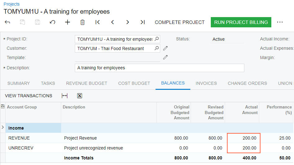- On the Projects form, open the TOMYUM1U project, and on the Balances tab, review the amounts in the budget lines that have been updated as a result of the billing. Actual Amount for the UNRECREV account group is now $400.