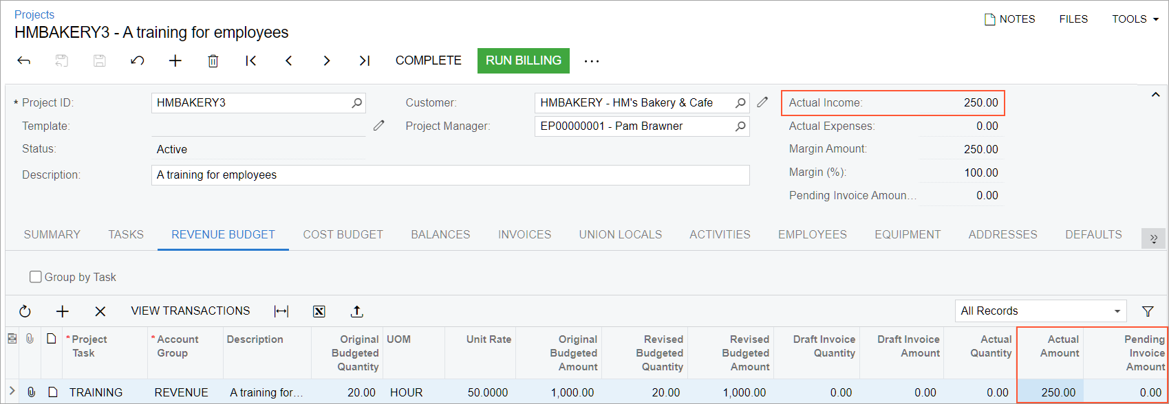 - On the Revenue Budget tab, specify 25 as the Completed (%) in the only revenue budget line to indicate that 25 percent of the project task has been completed (5 hours of 20). The system calculates the Pending Invoice Amount as $250. Because the project has a nonzero Pending Invoice Amount in the revenue budget line, you can now bill the project.