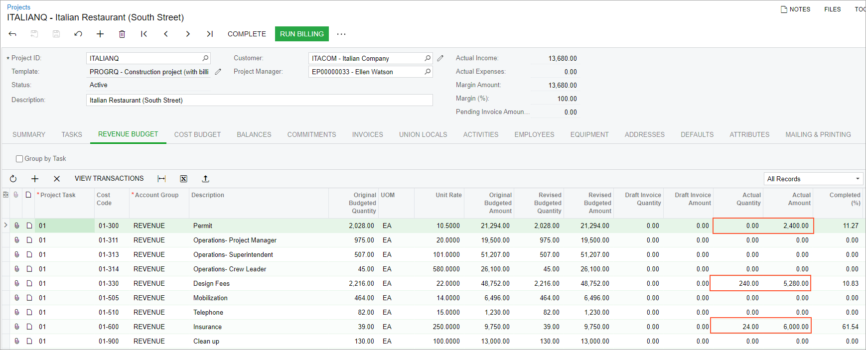 - On the Revenue Budget tab, in the line of the table with the 01-300 cost code and the Permit description, enter 2400 in the Pending Invoice Amount column.