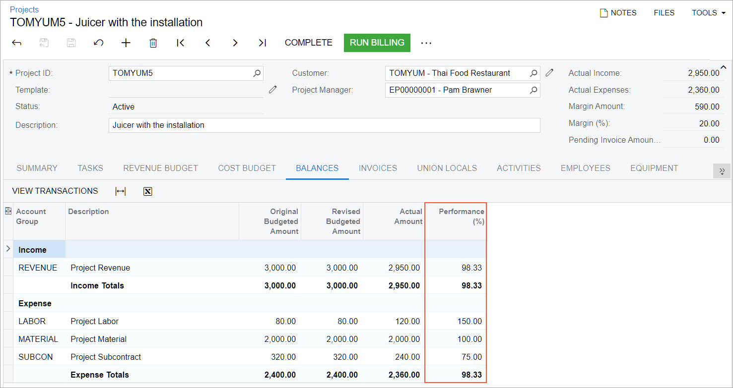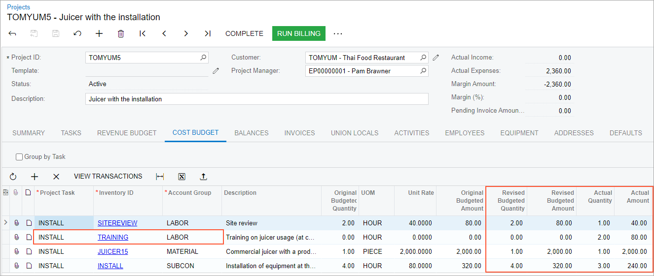 On the Cost Budget tab, review the cost budget of the project. Notice that the system has created a new budget line with the TRAINING item because the Detailed level of the cost budget update is specified in the project accounting preferences. The system has also updated the Actual Quantity and Actual Amount of the budget lines based on the released transactions (see the following screenshot). You can compare revised budgeted values with actual ones and track the performance by budget line in the Performance (%) column.