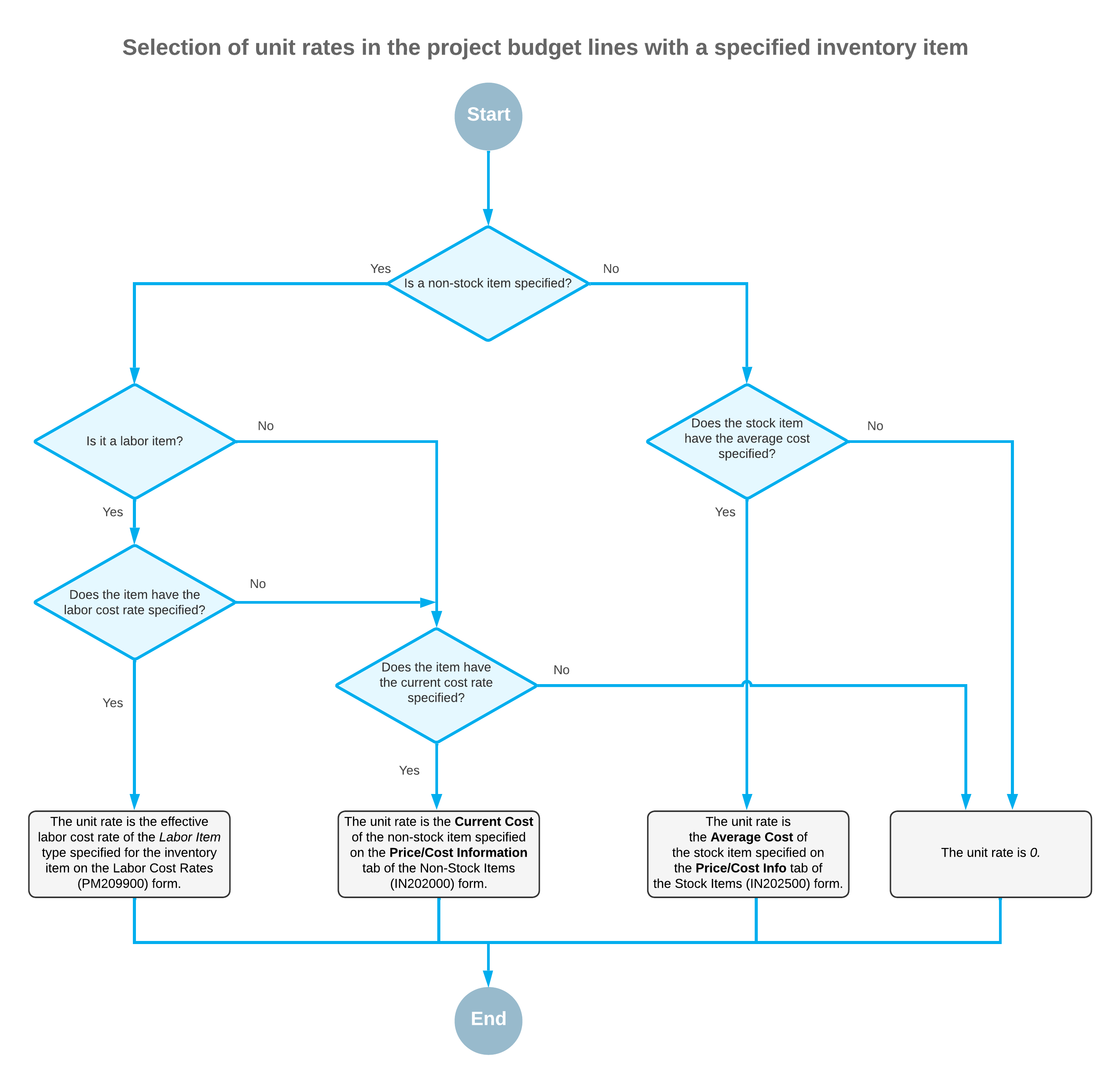 - For a non-stock item with the Labor type selected in the Type box on the General tab (Item Defaults section) of the Non-Stock Items (IN202000) form, the system searches for the applicable labor cost rate. That is, it searches for a rate of the Labor Item type on the Labor Rates (PM209900) form that is associated with the same inventory item and has an effective date that is after the document date or the start date of project.