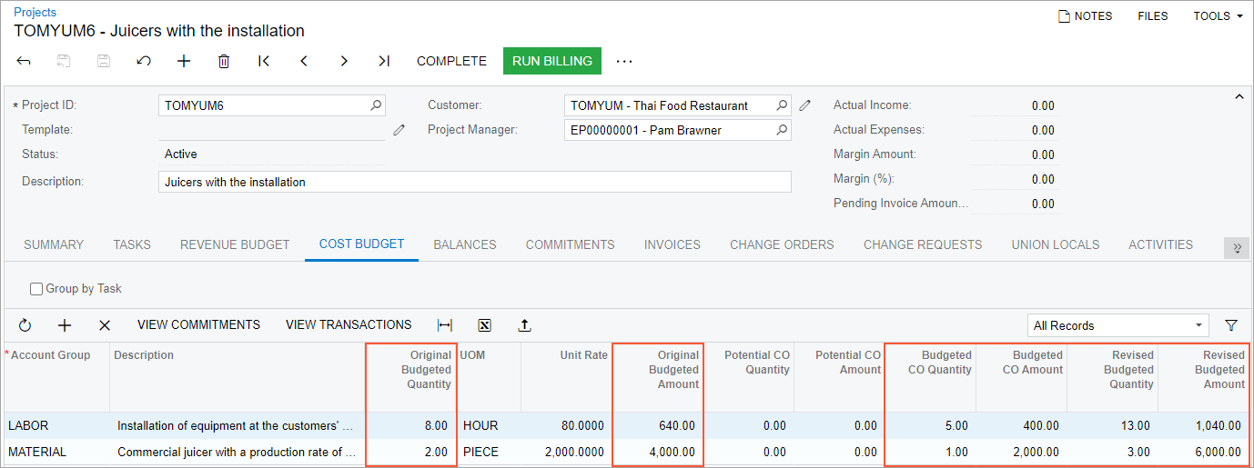 Suppose that the Thai Food Restaurant customer has ordered two juicers, along with eight hours of the installation service from the SweetLife Fruits & Jams company. SweetLife's project accountant has created a project and configured the revenue and cost budgets based on the agreement reached with the customer. During project execution, the customer requests one more juicer, along with the installation, as a part of the same project. The project accountant has estimated that the installation of this additional juicer will require five hours of the installation service. Also, the project accountant has decided to track these changes to the project at the budget level because the installation of the third juicer was not planned initially.