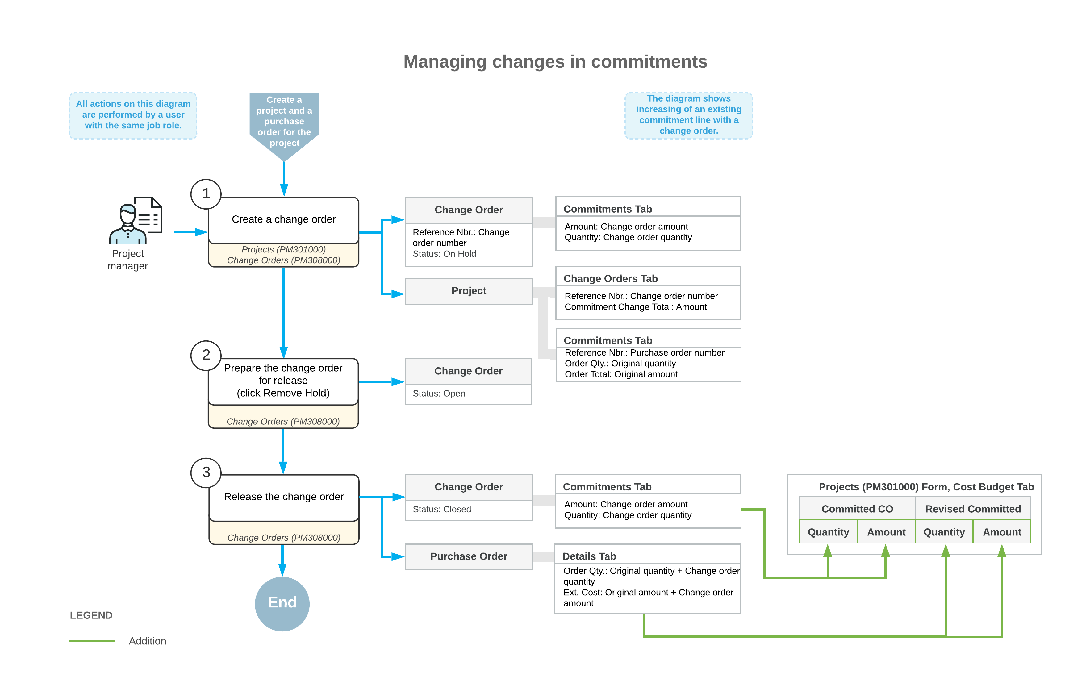 When you release the change order, based on the Quantity and Amount of a commitment line on the Commitments tab of the Change Orders form, the system updates the related commitment document or creates a new one, depending on the type of the commitment line, and updates the Committed CO Quantity, Committed CO Amount, Revised Committed Quantity and Revised Committed Amount of the corresponding cost budget line of the project on the Projects (PM301000) form. For more information, see Change Orders for Commitments: Commitment Updates on Release of Change Orders.