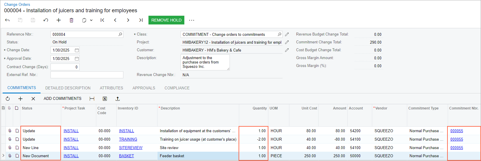 Suppose that the HM's Bakery and Cafe customer has ordered the services of installation and employee training on operating the previously bought juicer from the SweetLife Fruits & Jams company. The project accountant of SweetLife has created the project in MYOB Acumatica and ordered the following services from the Squeezo Inc. vendor: