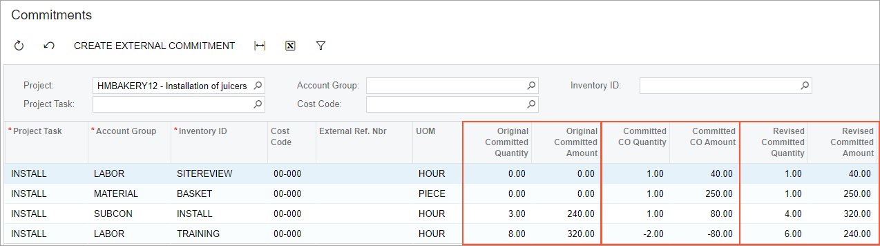 - On the Projects (PM301000) form, open the HMBAKERY12 project, and on the Commitments tab, [3]insert2024/09/1713:33:16+02:00notice that the project has only one related purchase order, which is the one you have just created. On the Cost Budget tab, review the original committed values and the revised committed values. Notice that the original committed quantity of each line equals the revised committed quantity (8 for the TRAINING item and 3 for the INSTALL item) and the original committed amount of each line equals the revised committed amount ($320 for the TRAINING item and $240 for the INSTALL item).