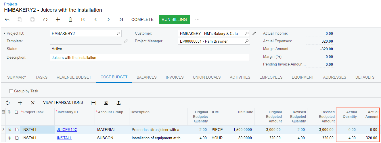 On the Cost Budget tab, review the actual values of the cost budget. Notice that the Actual Quantity and Actual Amount of the line with the INSTALL item have been updated and are now 4 and 320.00, respectively (see the following screenshot). The actual values for the line with the stock item (JUICER10C) are not updated yet: the system will record the cost of stock items to the project budget when the items are used for the project and issued from the project-specific warehouse location.