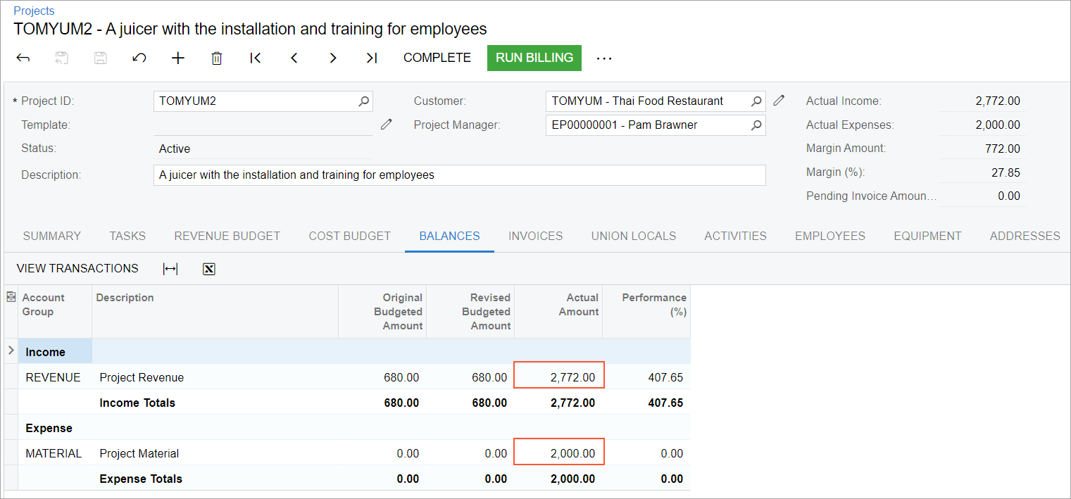 - While you are still viewing the TOMYUM2 project on the Projects (PM301000) form, on the Revenue Budget tab, specify 40 as the Completed (%) of each revenue budget line. Notice that the system calculates the Pending Invoice Amount for each line ($112 for the PHASE1 project task, and $160 for the PHASE2 project task). This pending amount will be billed by the progress billing step of the billing rule assigned to the PHASE1 and PHASE2 project tasks.