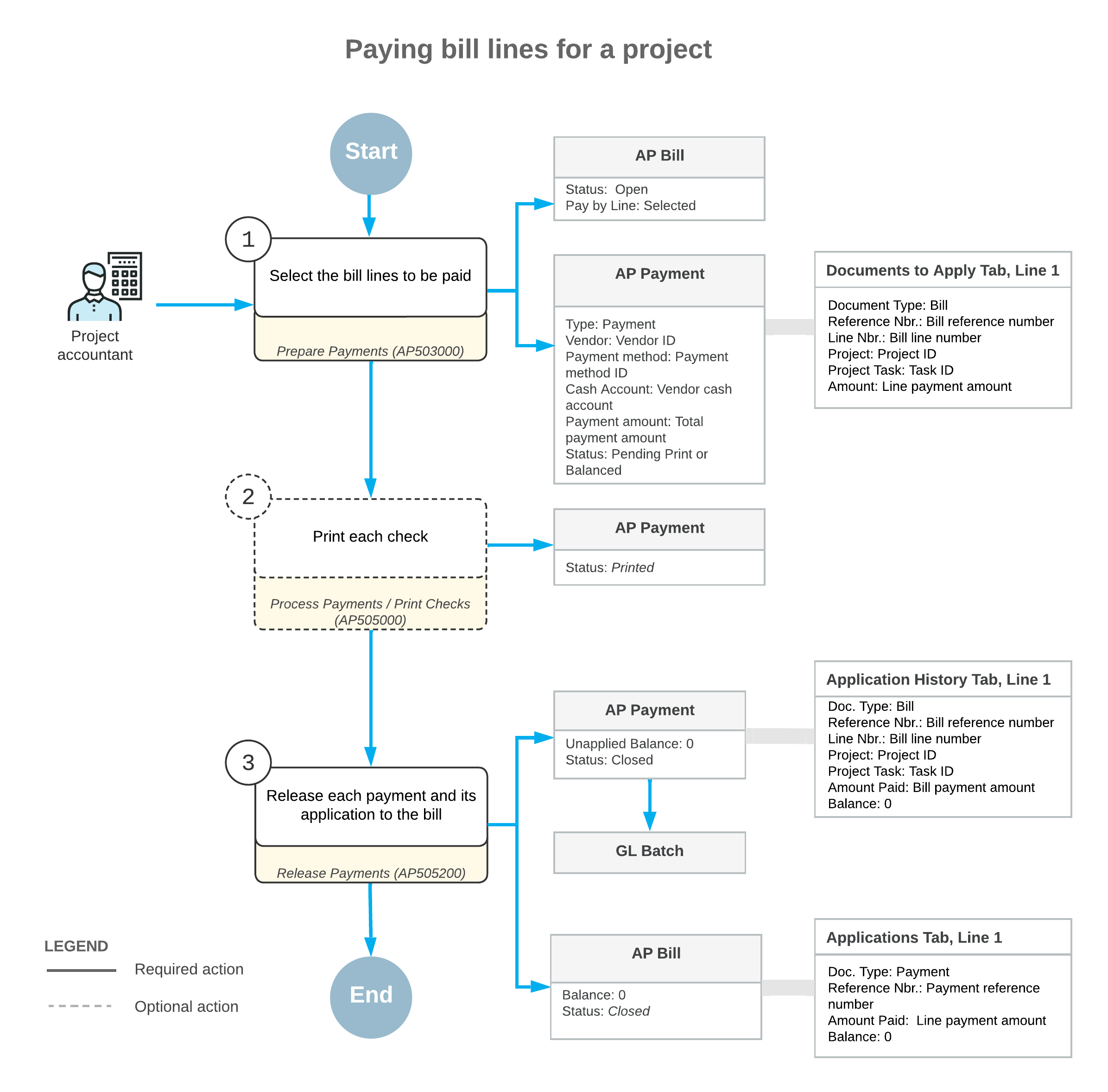 The following diagram illustrates the workflow of processing payment for individual bill lines related to a vendor’s work on a project.