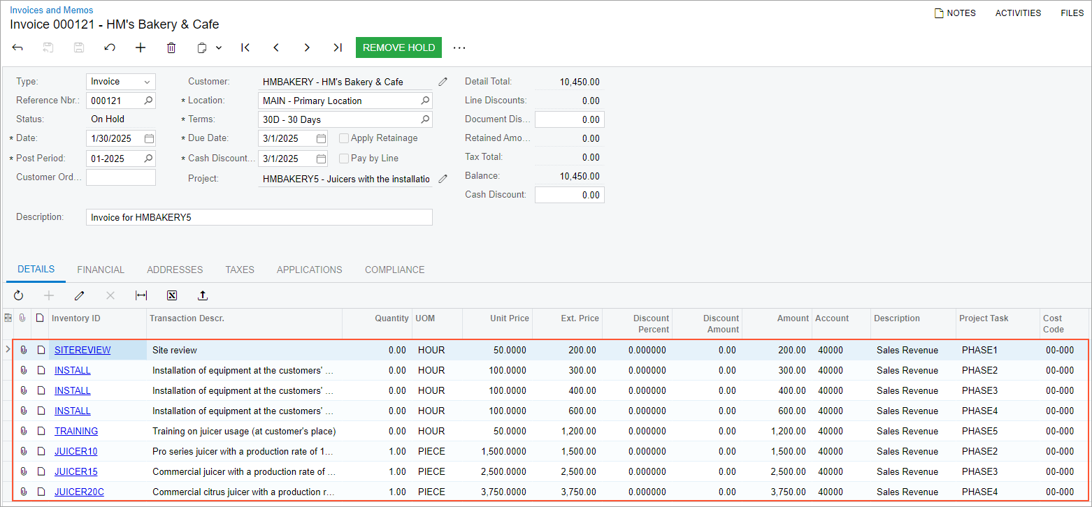- On the Projects form, open the HMBAKERY5 project, and review the Invoices tab. Notice that in the only line, the reference numbers of the prepared pro forma invoice and the corresponding accounts receivable invoice are shown in the Pro Forma Reference Nbr. and AR Reference Nbr. columns, respectively. The total billed amount in the AR Doc. Orig. Amount column is $10,450.
