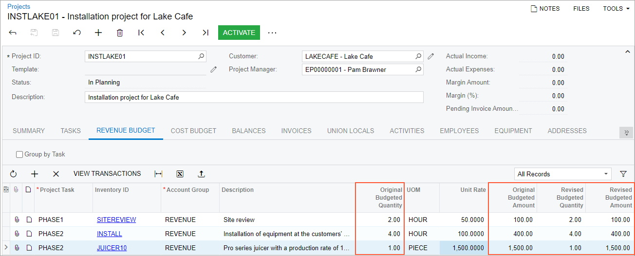 Project Task Inventory ID Account Group Original Budgeted Quantity Unit Rate PHASE1 SITEREVIEW REVENUE 2.00 50.00 PHASE2 JUICER10 REVENUE 1.00 1,500.00 PHASE2 INSTALL REVENUE 4.00 100.00 - Make sure that the original and revised values in the revenue budget lines have