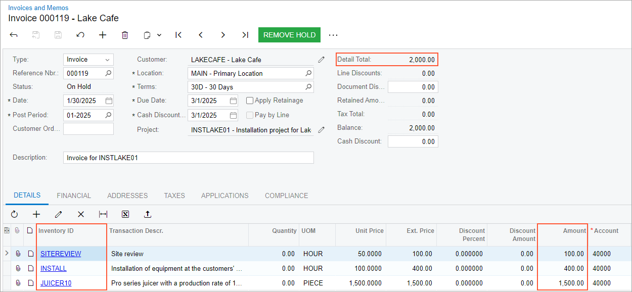 - On the form toolbar of the Invoices and Memos form, click Remove Hold to assign the Balanced status to the accounts receivable invoice, and then click Release.