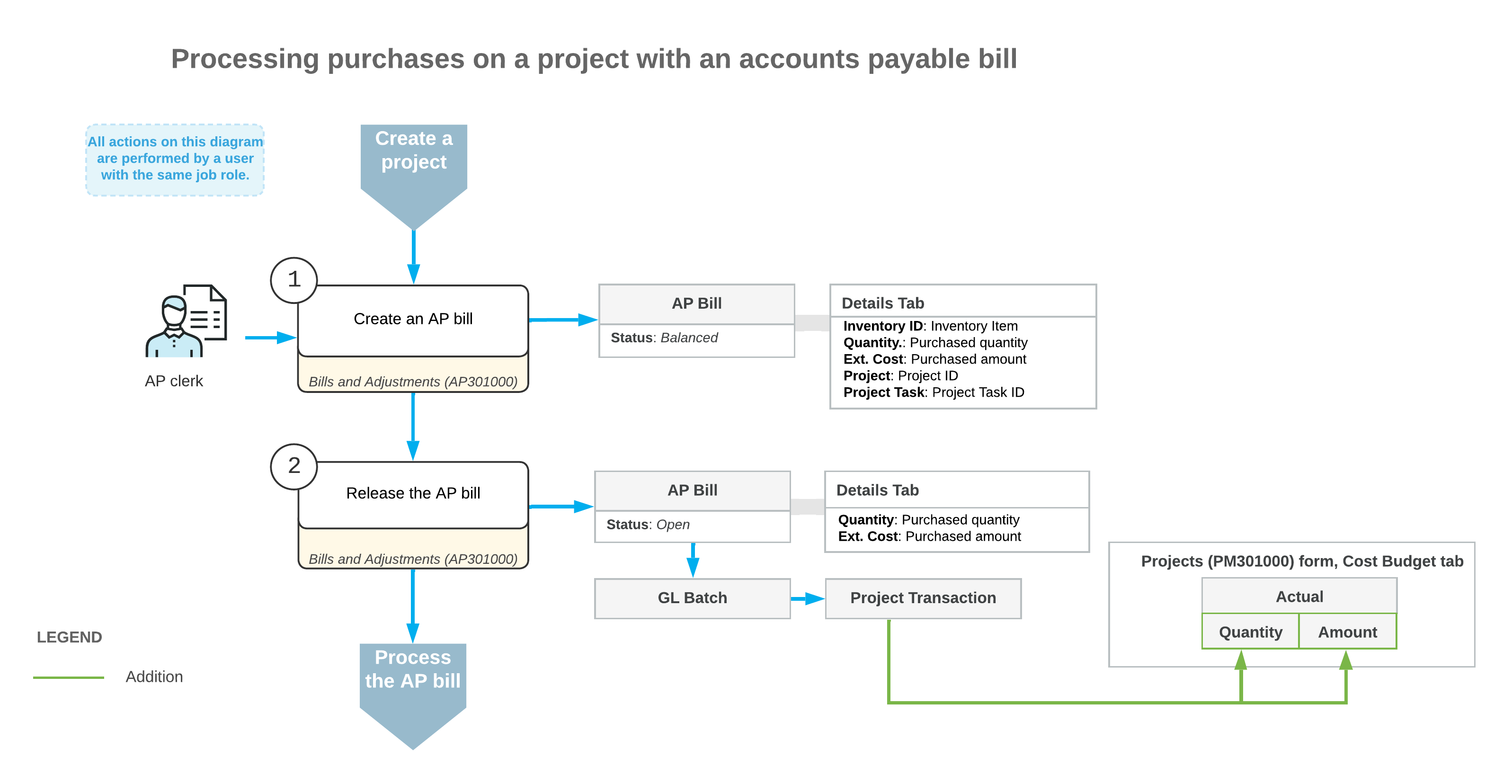 The following diagram illustrates the workflow of purchasing services for projects using accounts payable bills.