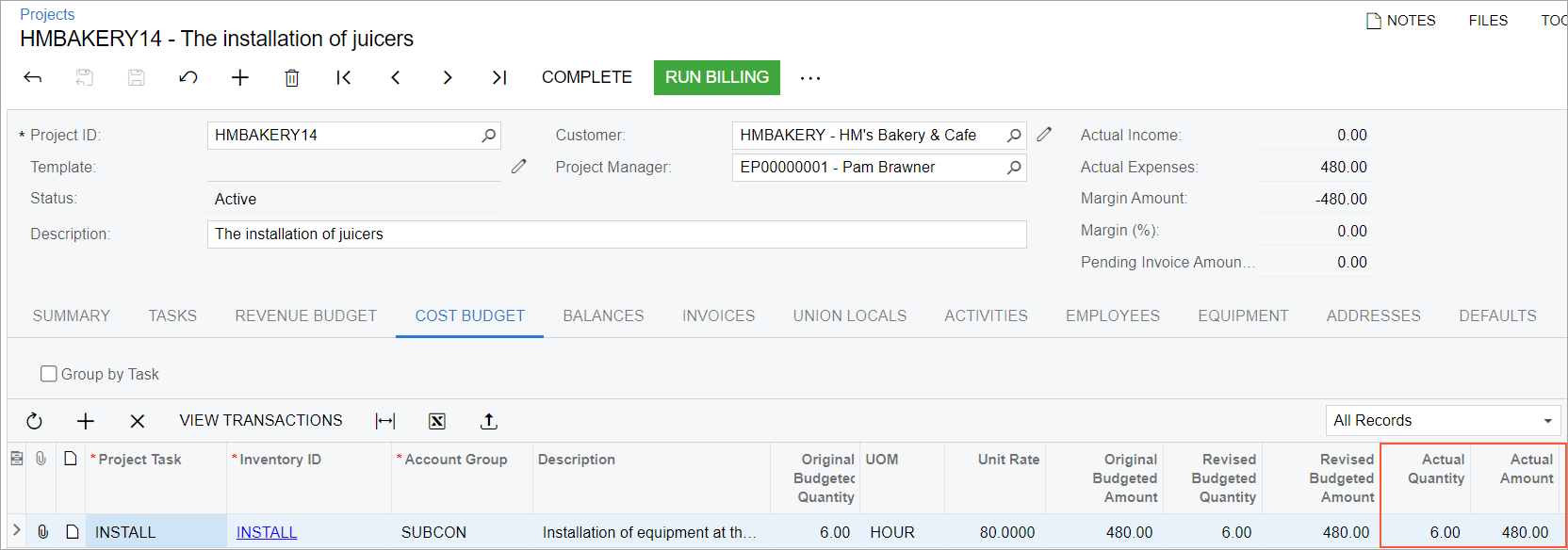 - On the Projects (PM301000) form, the HMBAKERY14 project has been created, and the INSTALL project task has been created for the project. This task is the default project task.