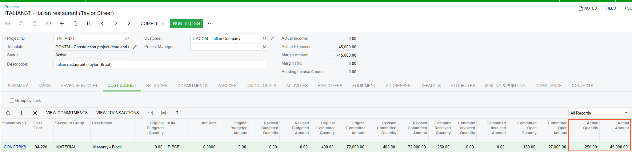 Notice that the original committed and revised committed values of the cost budget line have been updated by the purchase order total (72,000.00). The actual quantity and actual amount in the line are zero because the expenses have not yet been recorded to the project.