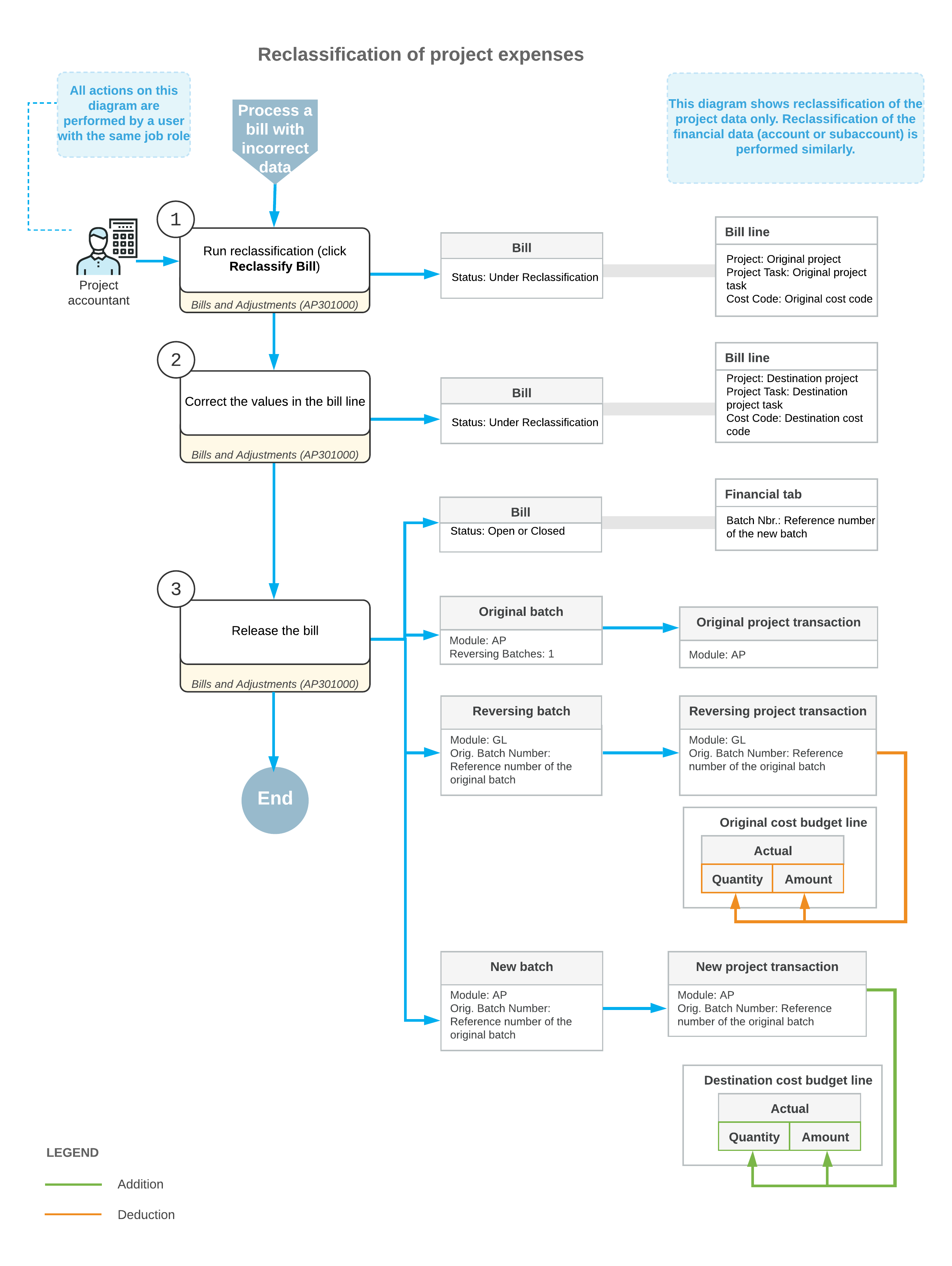 For the reclassification of project expenses, the typical process involves the actions and generated documents shown in the following diagram.