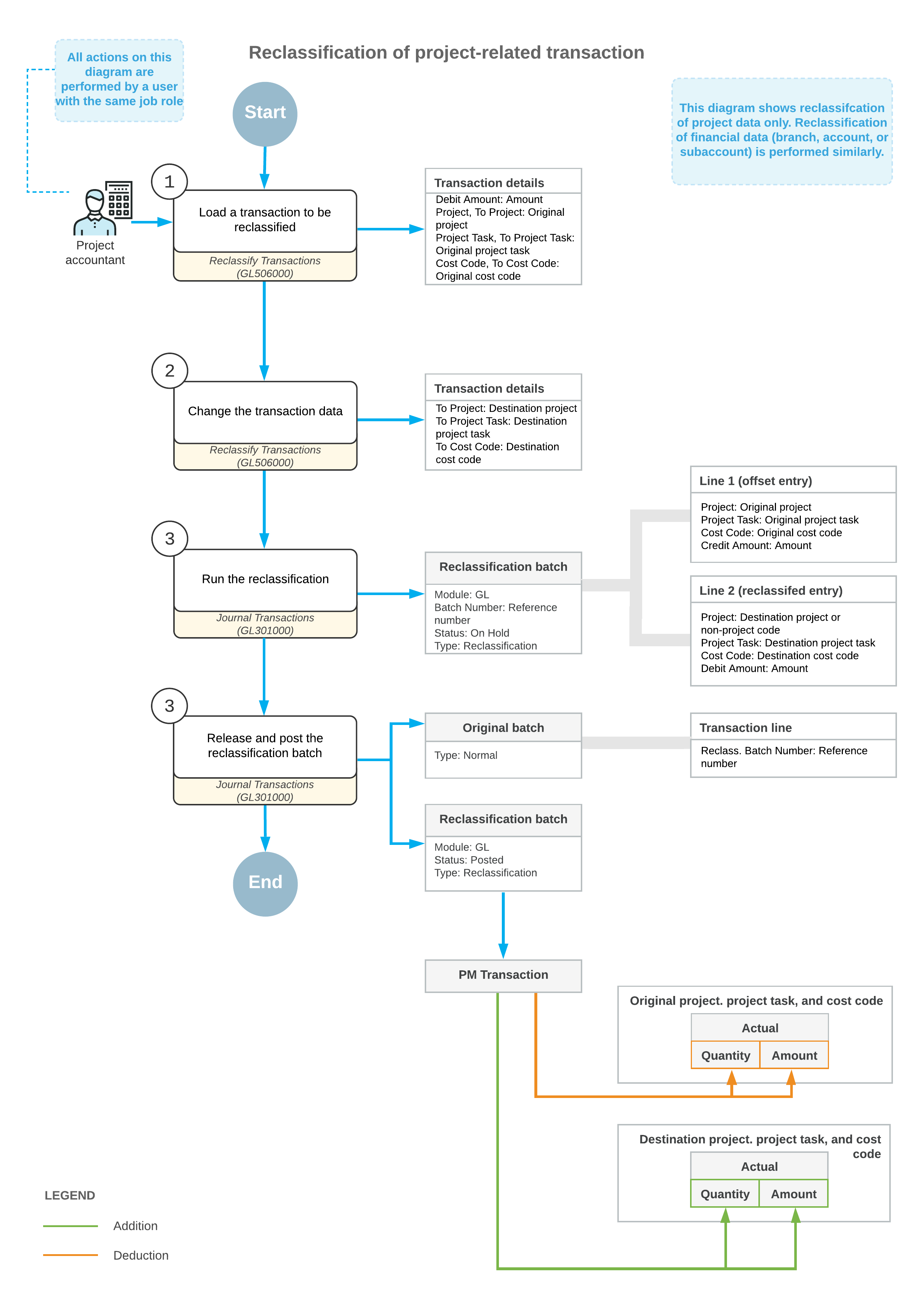 After you have made all needed changes to the transaction details, you click Process on the form toolbar of the Reclassify Transactions form. The system generates a new GL transaction of the Reclassification type that offsets the original transaction and posts the transaction amounts. Also, on release of the reclassification batch, the system generates a project transaction that updates the actual values in the project budget of the project for which the reclassification has been performed.