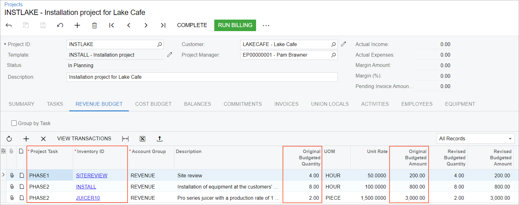 - On the Revenue Budget tab, make sure that three revenue budget lines have been copied to the project from the selected project template.