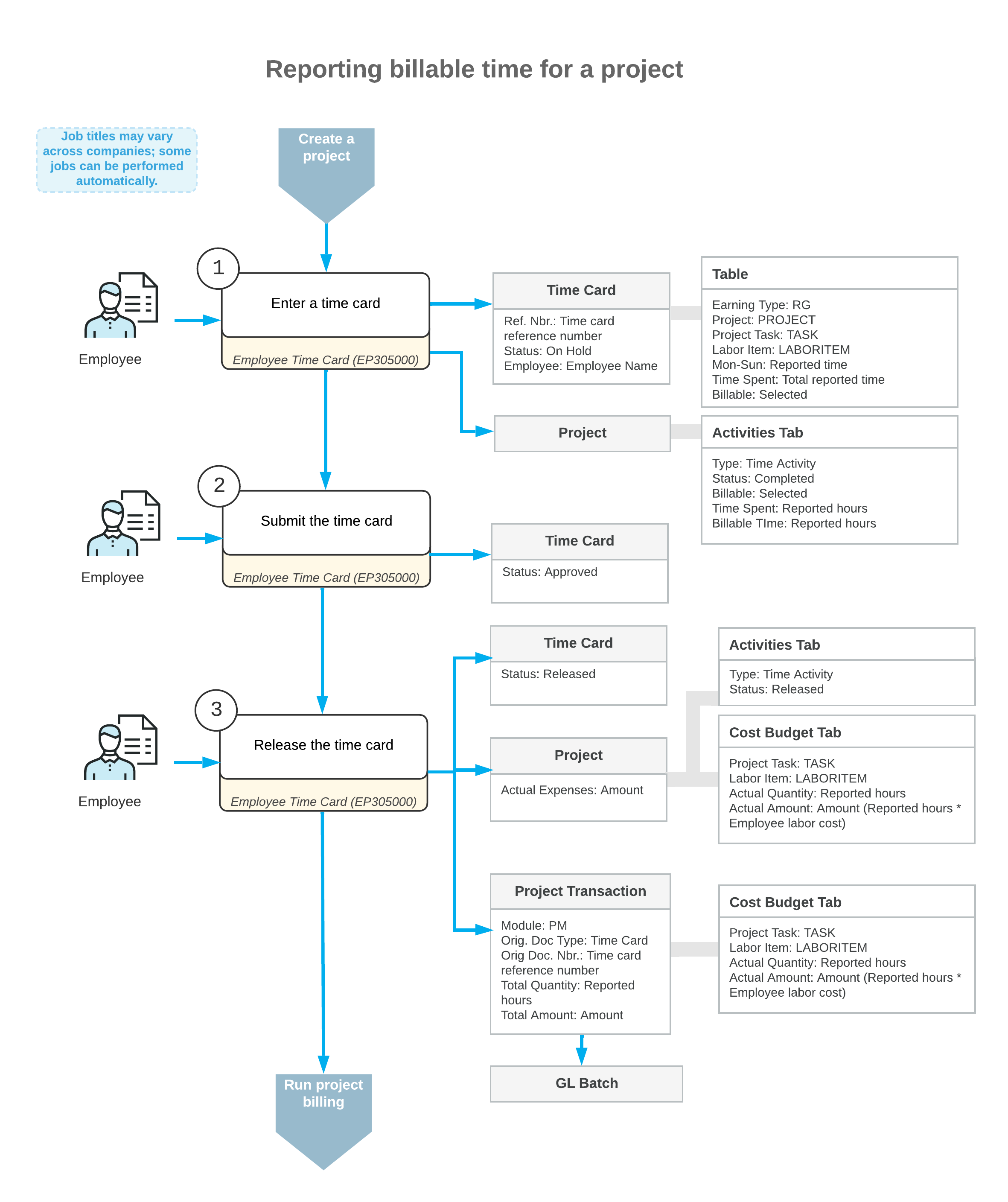 This extra step between the release of the time-tracking document and the updating of balances of general ledger accounts makes it possible to define labor costs and bill customers based on these costs and the quantity of working hours reported by employees for the project. The system further processes the project transactions originating from a time card based on the allocation or billing rules assigned to the project tasks of the project to which this transactions relates.