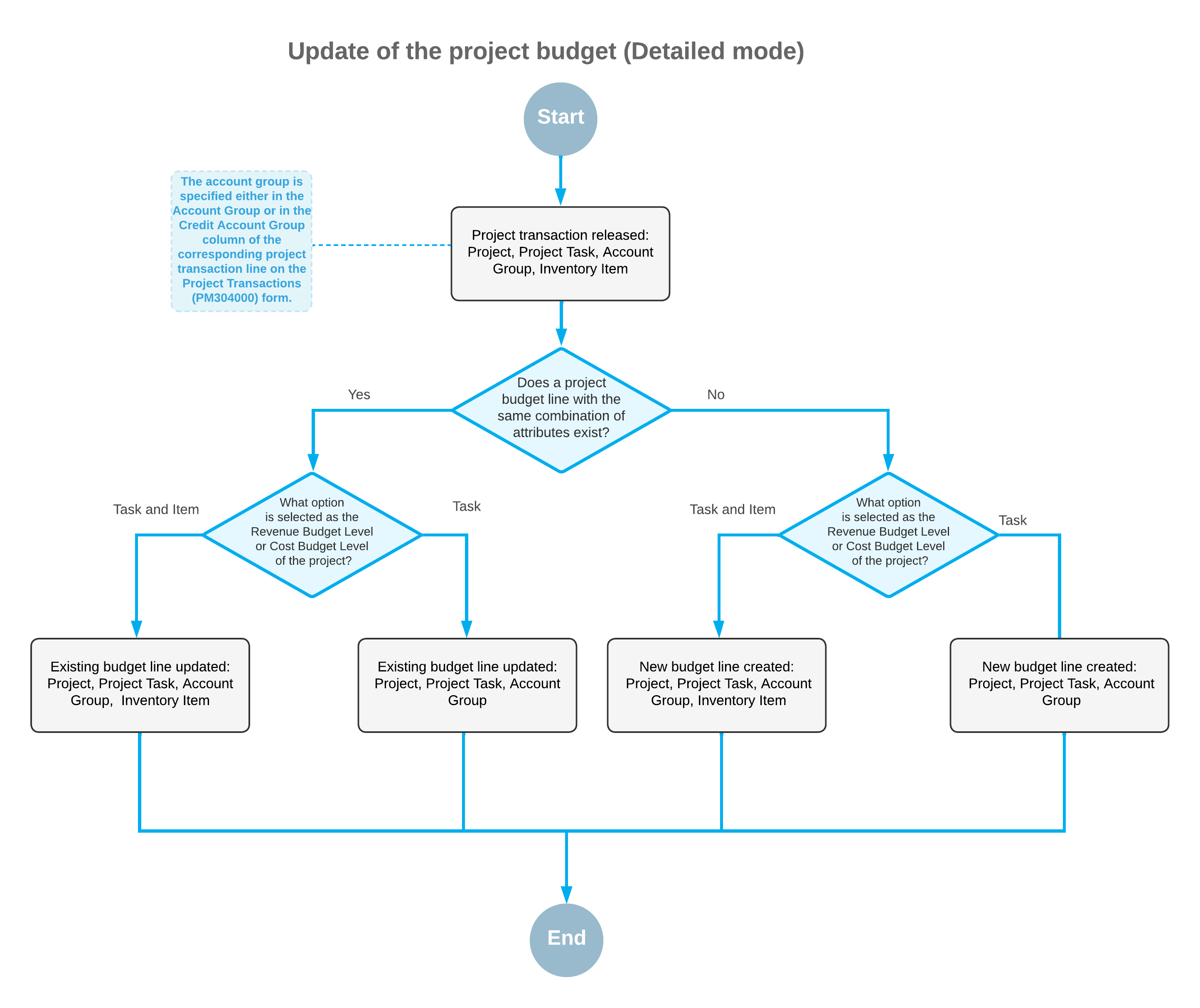 The following diagrams illustrate how the system updates the project budget on the release of a project transaction depending on the budget update preferences, the settings of the budget level in a project, and the project transaction details.