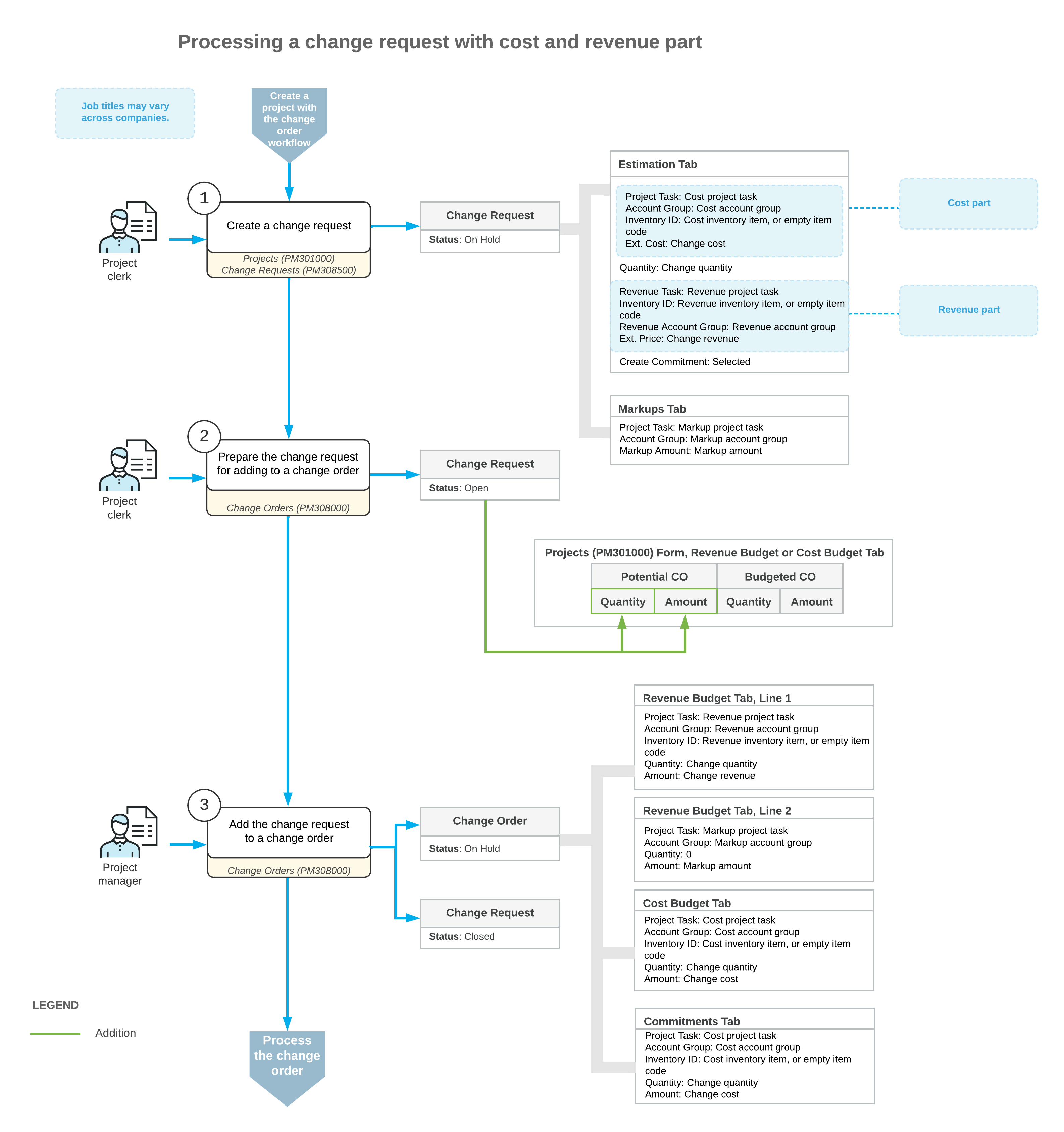 [5]For future reference, consider something like this: You may need to update the project cost budget and commitments affected by a change request through a separate change order before the revenue part has been approved. For this change request, you process both of the following - A cost change order: A change order that contains only the cost and commitment parts of the change request based on the settings of the selected change order class. This change order is shown in the Cost Change Order Nbr. box in the Summary area of the [Change Requests] form. - A revenue change order: A change order that contains the revenue part of the change request as well as all types of estimation lines—that is, revenue budget lines, cost budget lines, and commitment lines. This change order is shown in the Change Order Nbr. box in the Summary area of the form.2023/05/1814:39:03-04:00If the project cost budget and commitments affected by a change request need to be updated through a separate change order before the revenue part has been approved, for this change request, you process a cost change order and a revenue change order.