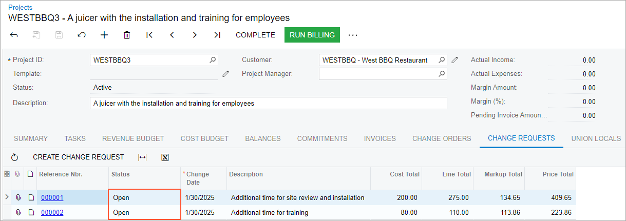 - In the only line on the Change Requests tab, the change request still has the Open status because the revenue part of the change request has not been processed yet.
