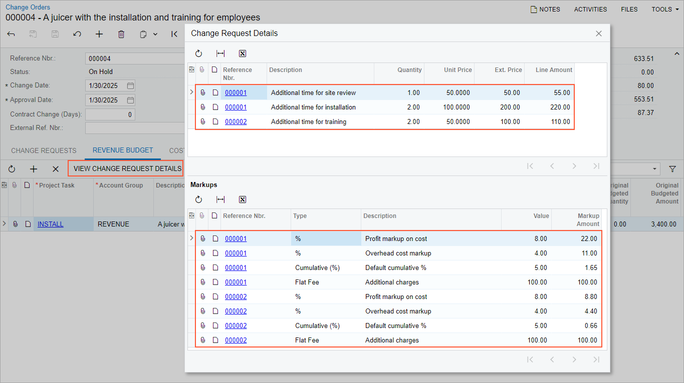 In the added lines, notice that both change requests have been assigned the Closed status because the change requests have been fully processed with this change order. On the Cost Budget tab, notice that the system has added a line with 2 hours of training based on the estimation line of the second change request.