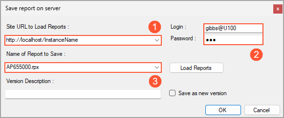 In the Save Report on Server dialog box, which opens, you specify the following: