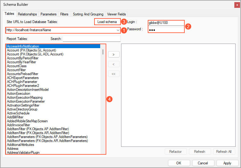 You can load the database schema of all available data access classes from the application server that you use to work with MYOB Acumatica. To load the database schema, you use the Schema Builder, which you invoke by clicking on the Report Designer menu bar. On the Tables tab, you specify the following settings: