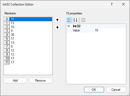 In the Members pane of the Int32 Collection Editor, the first number corresponds to the order of the column in the Excel grid. 0 is the first column (A) of the Excel grid, 1 is the second (B), and so on. To specify the width of each column, you click the column in the Members pane; then you specify the Value property of the right pane of the Int32 Collection Editor. The column width corresponds to the element width in pixels in an approximate 1:6 ratio. For example, the width of a column with a Value of 10 is approximately equal to the width of a text box with a of 60px.