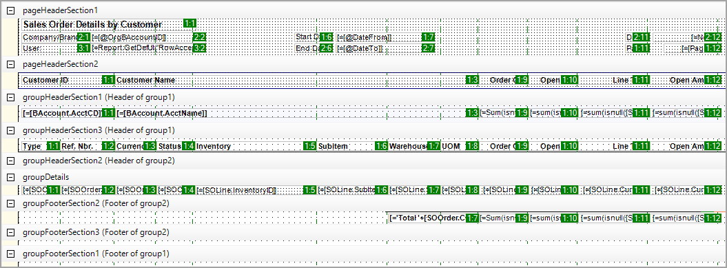 To display the Excel column grid, on the menu bar of the Report Designer, you click . In this display, each element on the report layout is marked with two numbers divided by a colon (see the following screenshot).