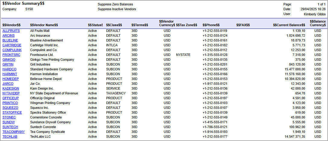 - In MYOB Acumatica, open the S150 Vendor Summary (AP6550C5) report form by searching for its
