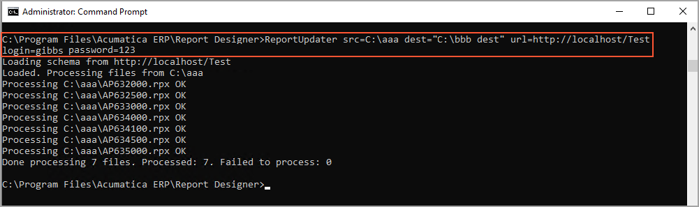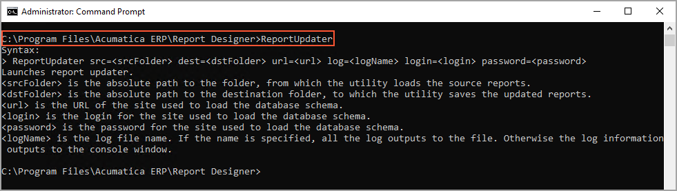 - You can get the help information for the ReportUpdater by launching the utility in the command prompt without parameters, as the following screenshot shows.
