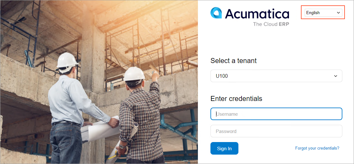 When a user runs the resulting report, the system applies the standard format specifiers by using the language this user selected when signing in to MYOB Acumatica, as shown in the following screenshot. If your instance of MYOB Acumatica does not allow the user to select a language, the specifiers are applied by using the default language of the installed application, which is English (United States).
