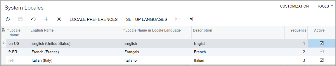 The list of the languages available at sign-in is specified on the System Locales (SM200550) form, as shown in the following screenshot.
