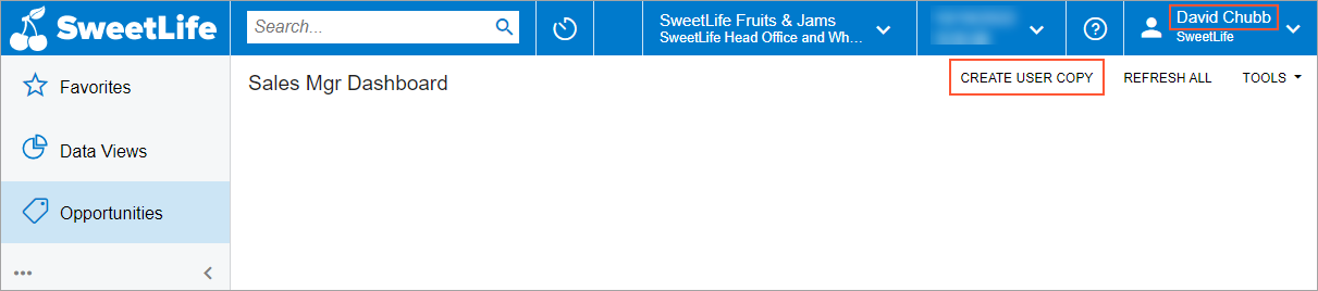 The system opens the dashboard, indicating that users with the Sales Manager role can access the dashboard. On the dashboard title toolbar, notice that the Create User Copy button is available (as shown in the following screenshot). This illustrates that users with the Sales Manager role can create a personal copy of the dashboard.