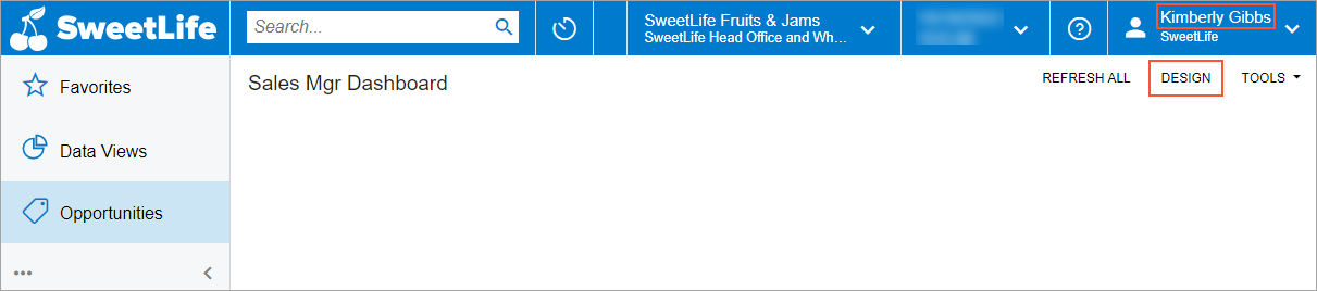 The system opens the dashboard, indicating that you have the needed access rights to view the dashboard. On the dashboard title toolbar, notice that the Design button is displayed (as shown in the following screenshot). This means that as an owner of the dashboard, you can populate it with widgets.