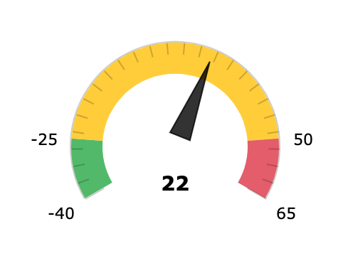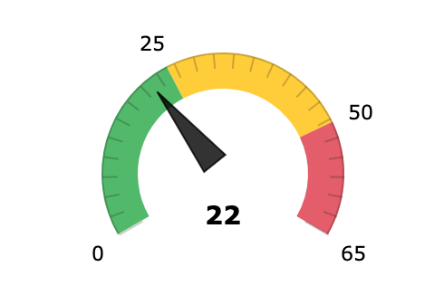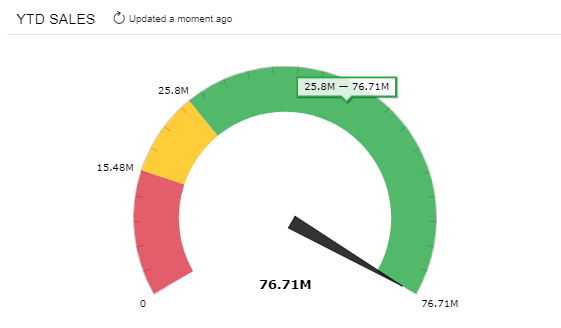 A meter widget uses a needle and colors to show data similarly to a reading on a speedometer. Meters are useful when you need to monitor all levels of the data (normal, warning, and alarm), with the colors and values that the user designing the widget has assigned to each level. For an example of a meter KPI widget, see the following screenshot.